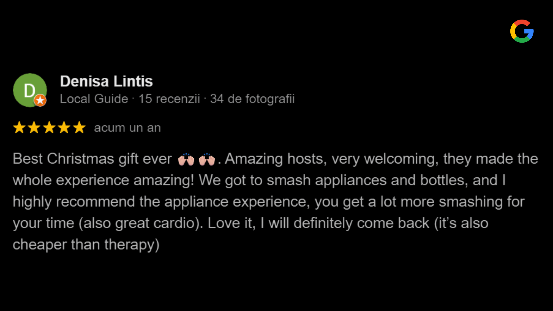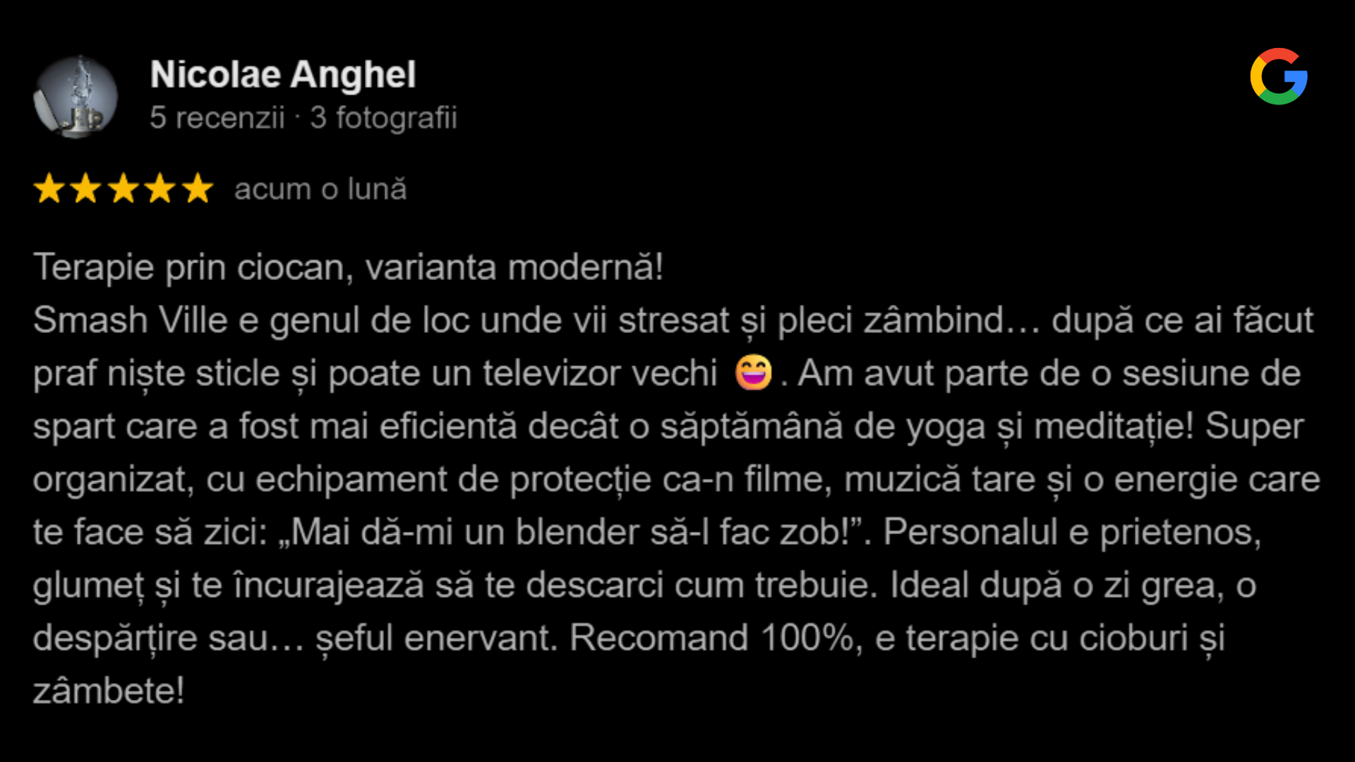 Fie că vii după o săptămână încărcată, după o ceartă sau pur și simplu din dorința de a încerca ceva nou, Rage Room-ul te ajută să îți transformi energia negativă în distracție pură și eliberare.