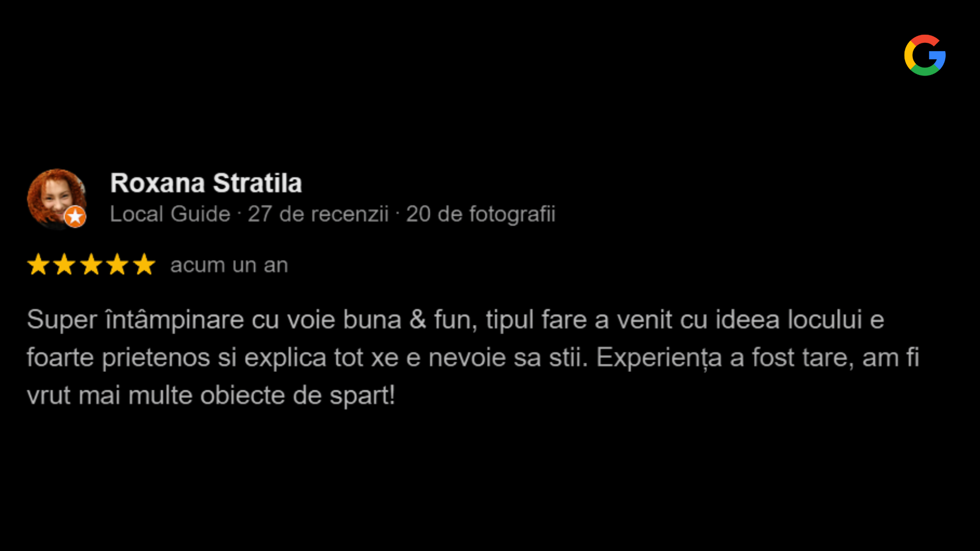 Rage Room-ul nostru îți oferă un mediu controlat, unde poți „descărca” tot ce simți, fără să faci rău nimănui și fără să lași în urmă decât cioburi, râsete și amintiri frumoase.